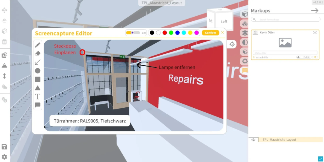 Unser Kundenportal bietet dir jederzeit Zugriff auf das aktuelle 3D-Modell, die dazugehörigen Pläne und den 3D-Scan. Dies ermöglicht dir dein Bauprojekt vor Umsetzung virtuell zu begehen und den Planungsprozess zu überwachen. Sowohl im Scan als auch im Modell kannst du millimetergenaue Messungen vornehmen. Änderungswünsche im 3D-Modell kommunizierst du bequem via „Markup tool“ an den zuständigen Planer, der dich benachrichtig, sobald das Modell aktualisiert wurde.