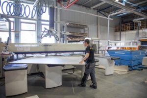 In unserer eigenen Produktion werden die Bauteile vorab hergestellt. Dadurch können die Möbel auf der Baustelle mit Hilfe von Plug-and-Play-Systemen schnell montiert werden, was die Bauzeit erheblich verkürzt. Die 3D-Vermessung und Vorkonfektionierung stellen sicher, dass alle Komponenten genau bemessen und einbaufertig sind.